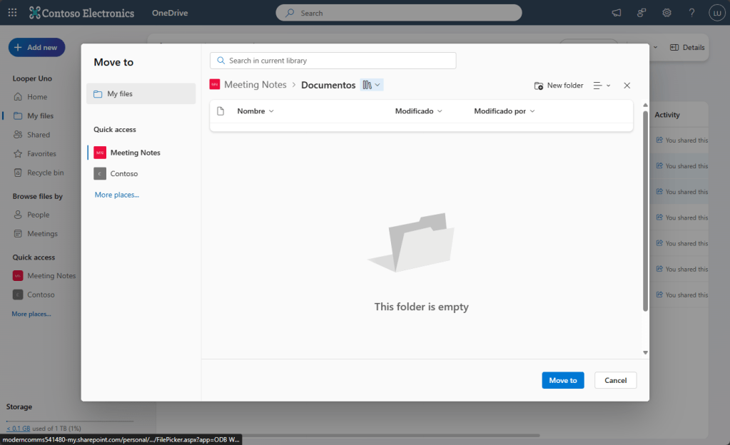 The person that is given access to Maria’s OneDrive in our example should search in the Meetings folder, find any .loop file and move/copy it to another more-persistent location like a folder in a SharePoint team site: