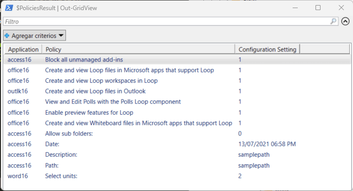 The script is in its initial v0.1 version at the time I publish this article, and it needs improvement, some basic error handling and add the ability to create an HTML report are in the To Do list, for now, it shows the policy settings in a PowerShell Grid View: