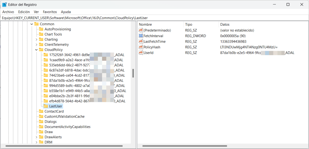 There is also another documented registry path, located at HKEY_CURRENT_USER\Software\Microsoft\Office\16.0\Common\CloudPolicy, there, the policy service check-in information is stored, on my case, I also had different folders representing the multiple users I work with:
