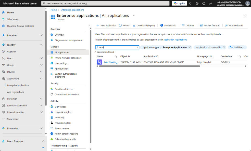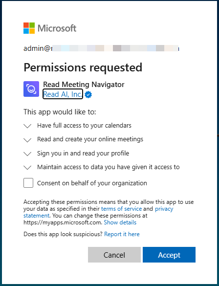 Last month, I wrote about blocking Otter.Ai from joining Teams Meetings. Joining a meeting, I noticed another AI Meeting service called “Read.Ai” so I wanted to know how it worked to record, transcribe and do AI stuff on the meeting. Essentially, it works pretty the same way as Otter.Ai, so you can open that other blog post in a new tab and read here to know the particularities of this “Read.AI” service, the same procedures to try to block it apply.