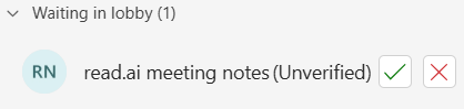 When joining another’s tenant meeting, I did notice that read.ai bot was trying to join so if you don’t want it you cannot admit it from the lobby or kick it out.