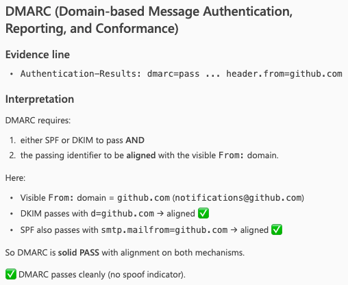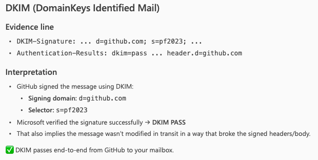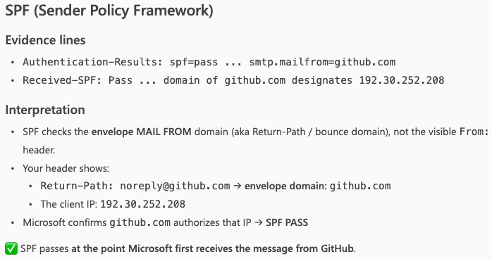 Copilot explained why the email headers showed that the Sender Policy Framework passed the checks (and it is right there in the header when it says domain of github.com designates 192.30.252.208 as permitted sender). The sender IP is included in the SPF DNS Record.