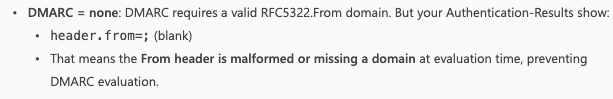 DMARC resulted in none because the from header was blank. All of this resulted in this e-mail identified as spam and sent to Junk folder.
